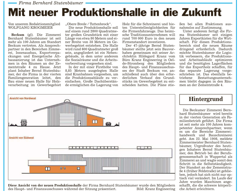 Derzeit erweitern wir unser Unternehmen um eine weitere Produktionshalle im Gewerbegebiet "Obere Brede / Tuttenbrock". Die Glocke berichtete bereits ausführlich über unser Bauvorhaben, wie Sie im Pressebericht nachlesen können.