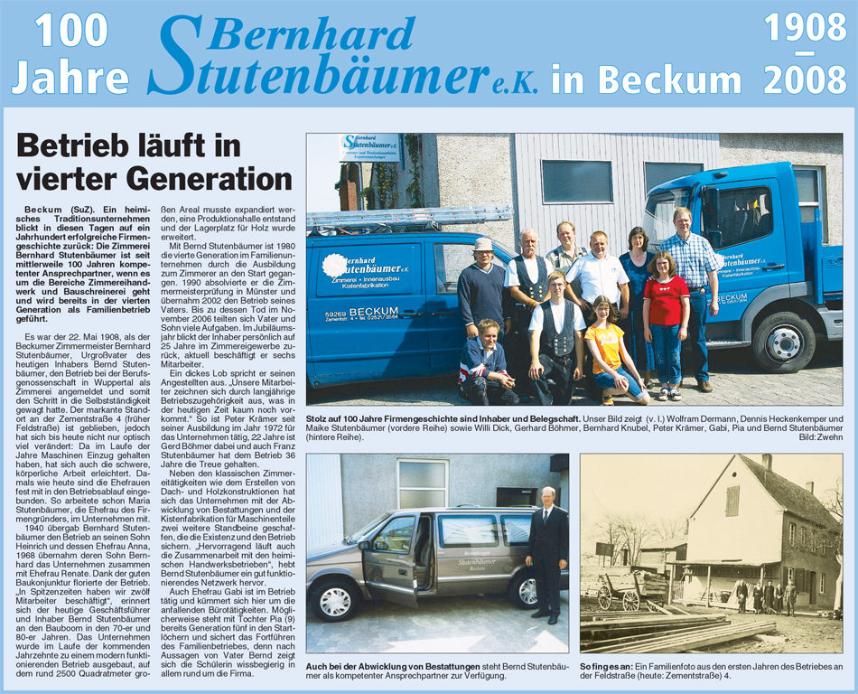 Am 22. Mai 1908, meldete der Beckumer Zimmermeister Bernhard Stutenbäumer, Urgroßvater des heutigen Inhabers Bernd Stutenbäumer, den Betrieb bei der Berufsgenossenschaft in Wuppertal als Zimmerei an und wagte somit den Schritt in die Selbstständigkeit.